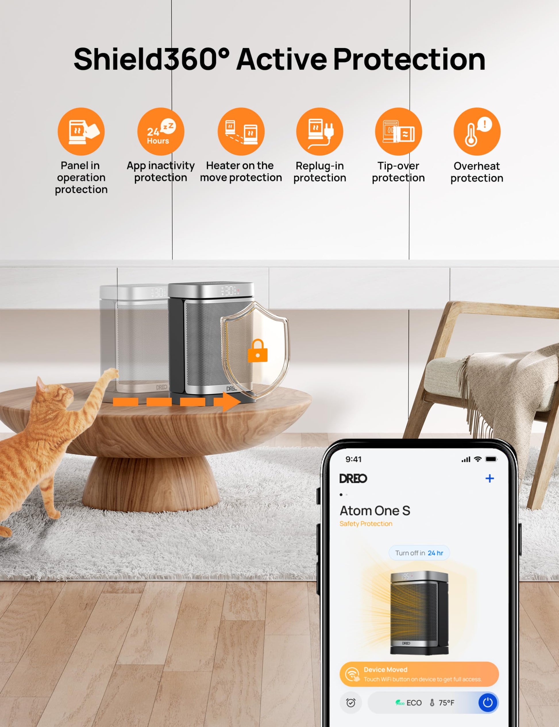 Weighed in only 4.4 pounds, Dreo Atom One comes with a hidden handle so you can carry around to wherever needed