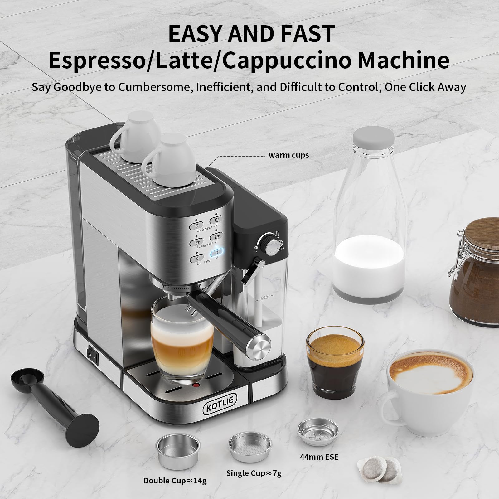 KOTLIE Espresso Coffee Machine with Automatic Milk Frother, 20Bar One-Touch Coffee Machines for Espresso, Cappuccino and Latte, ESE Pod Compatible, Black (CM5180-UK)