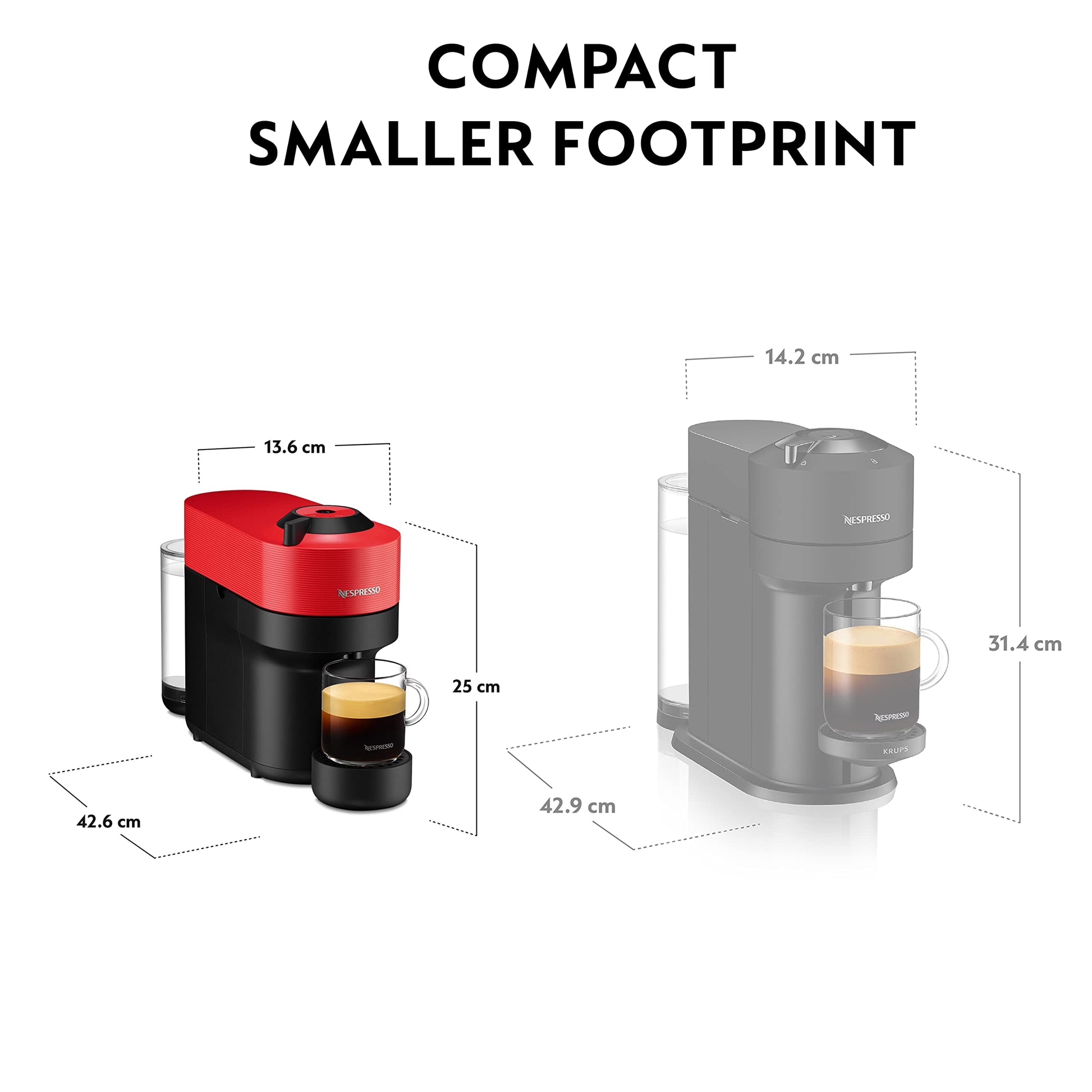- COMPACT COFFEE MACHINE – Smaller footprint that a standard Nespresso coffee machine with a water tank to match.