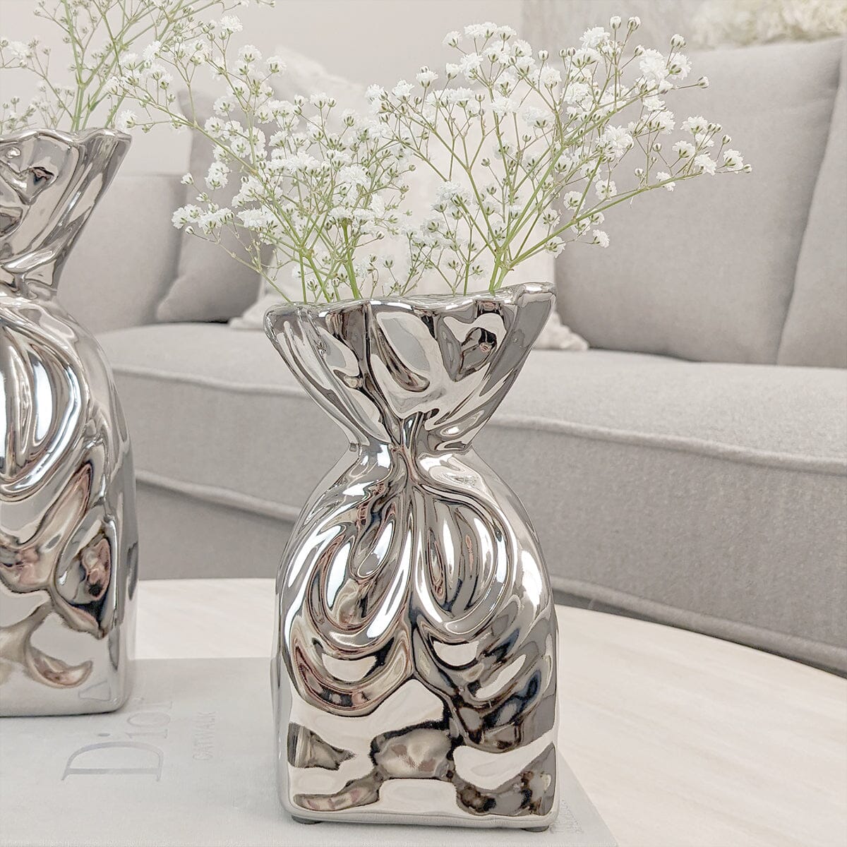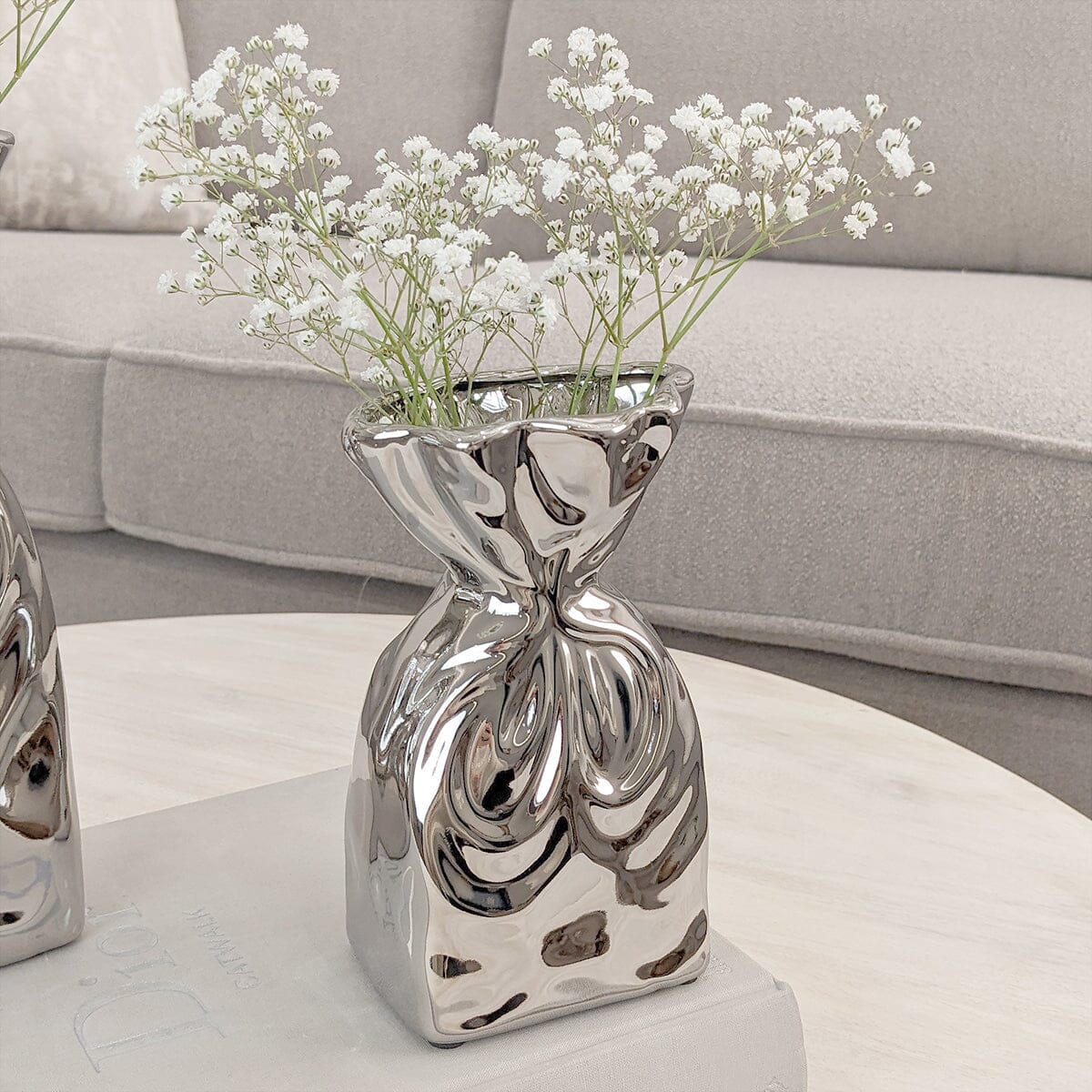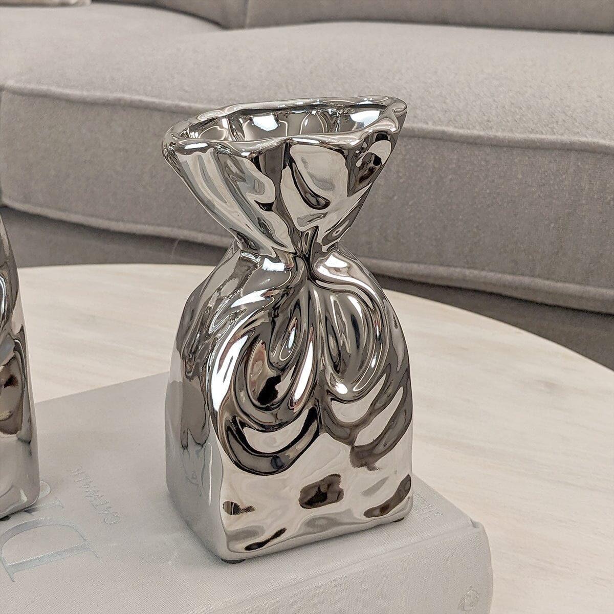 Add a statement piece to your home with the Tesora Petite Silver Crinkled Ceramic Bag Vase.